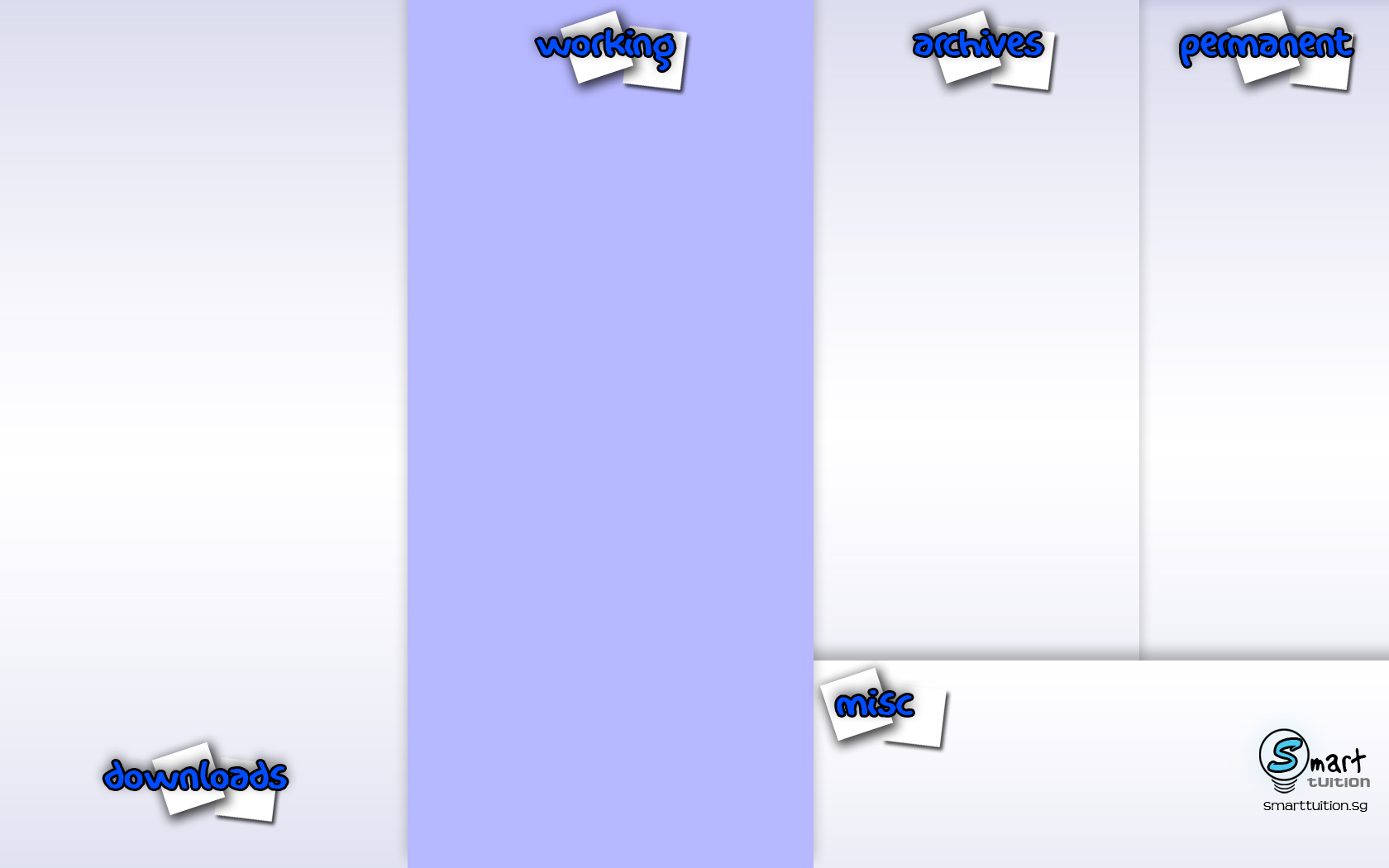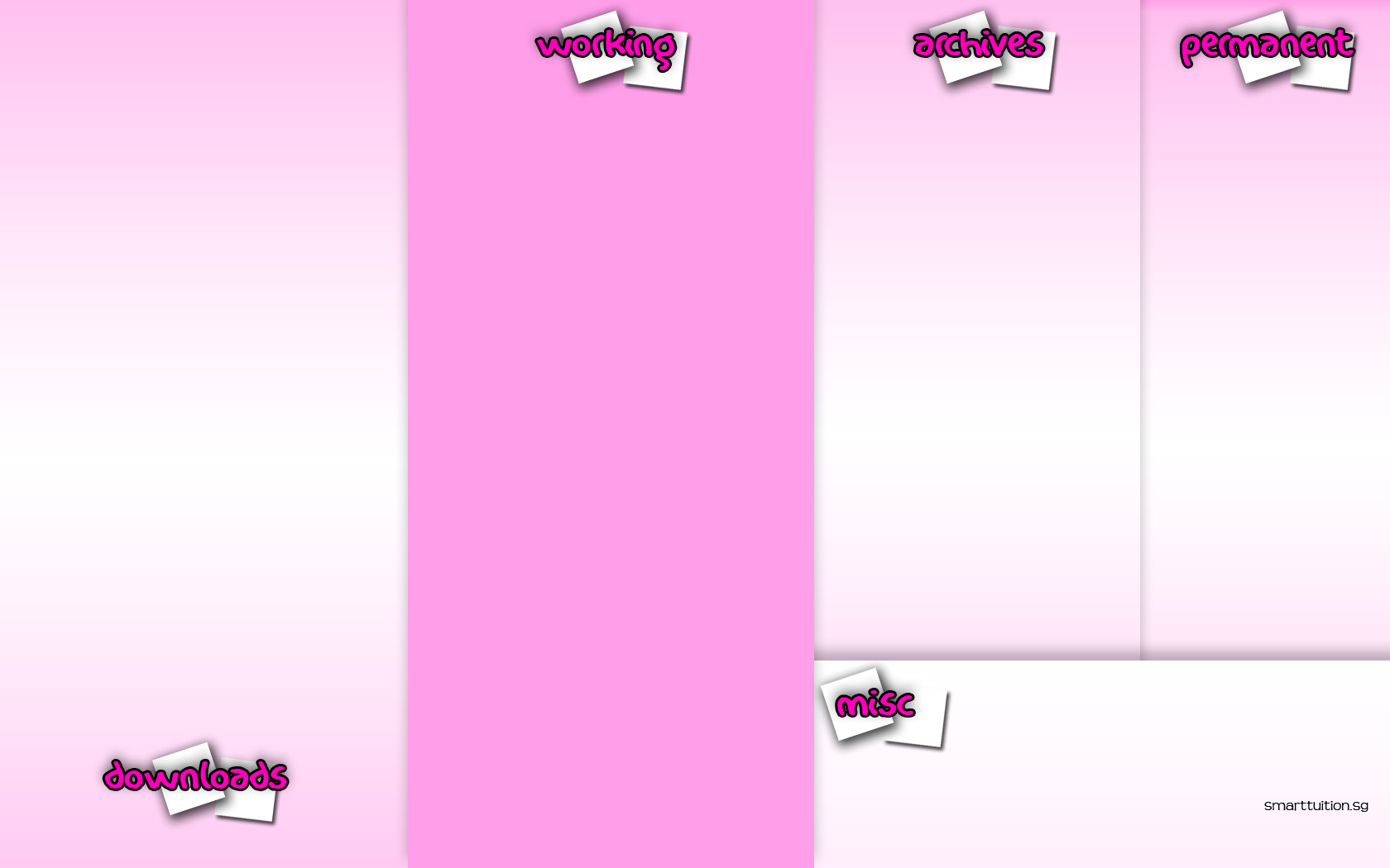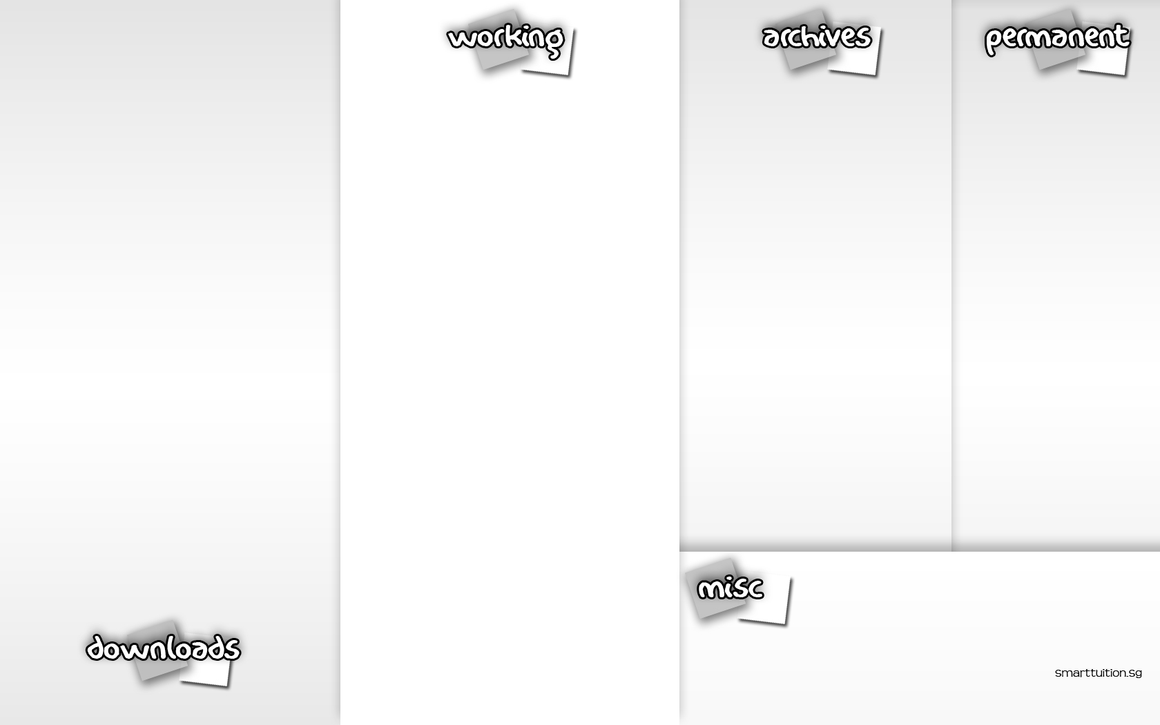 simplicity. There are four main columns - downloads, working, archives and permanent. Files on the left will be changed and moved more frequently. The decision to have the "downloads" column at the extreme left is because by default, downloaded files will be placed at the left. The extreme right column "permanent" is mainly for icons such as "My Computer" and "Recycle Bin". The "working" column is highlighted in another colour due to its importance. We hope this desktop wallpaper will be able to help people.